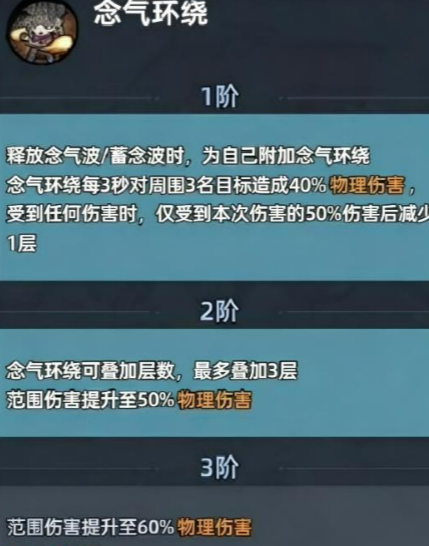 4.一星被动“念气环绕”提供战术容错:每次释放技能后,每3秒对周围敌人造成一次范围伤害,并为自身生成一个持续3秒、减伤50%的护盾。二星被动“雷龙出海”则进一步强化爆发链路:对感电目标造成额外100%伤害,并使其进入“雷龙状态”,在此状态下,目标所受普攻伤害再提升20%。两项被动与技能机制深度耦合,共同构建起“挂感电→开大→普攻触发→延长→持续增伤”的完整正向反馈闭环。
