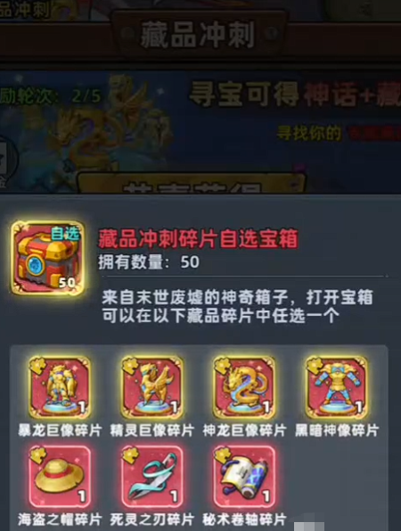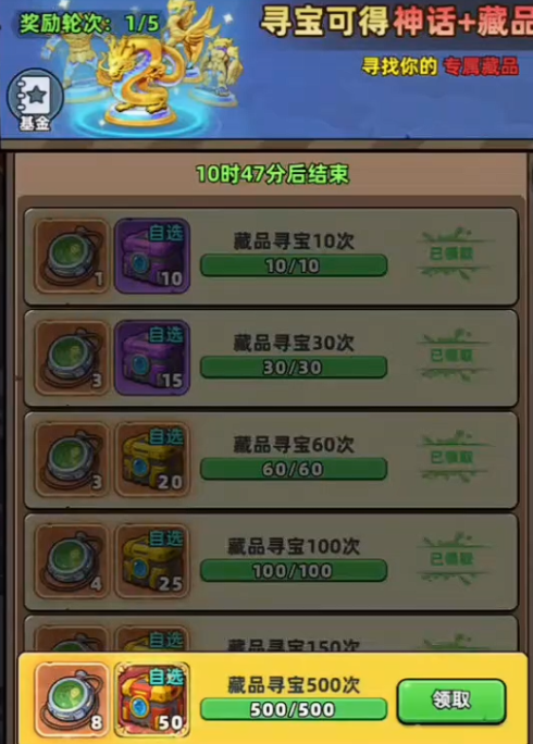 2.每次寻宝都有机会抽出大量藏品,另外游戏关于寻宝会设定保底,每抽取20次,有机会得到神话或者传说级别的藏品,常规抽取过程中,有机会获取普通的黄色品质藏品,建议玩家多在游戏里抽取,争取让自己得到更多高等级的藏品,连续抽取100次之后能直接获得藏品冲刺碎片自选宝箱,宝箱里面可以开出大量高等级藏品,玩家可以选择其中一个直接获取。