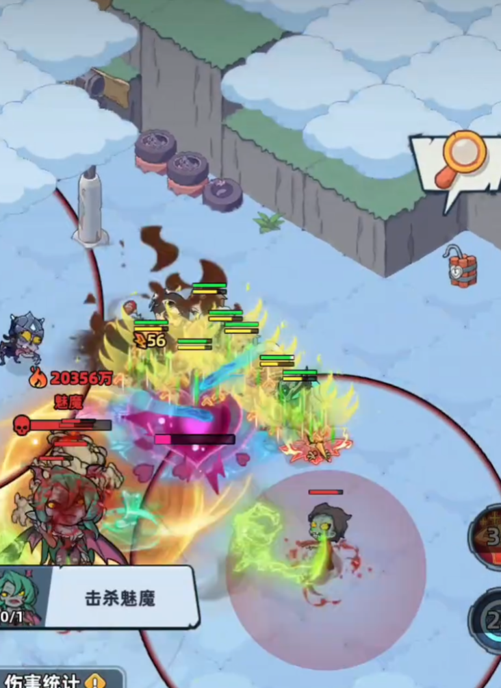 2.战斗共分三个阶段。第一阶段以护盾循环为核心:魅魔周期性陷入沉睡,但每次苏醒后会释放三道扇形范围技能,地面同步出现红色预警区域,需通过翻滚或横向位移规避;第二阶段转为小怪压制战,召唤的小丧尸单体血量厚、攻击频率高,对队伍整体练度与控场节奏提出较高要求;第三阶段即“全频攻击”登场——全屏泛红预警,但实际伤害并非无死角覆盖,而是存在固定落点区域与短暂判定延迟。此时有两种可靠应对路径:一是利用角色自带的位移技能(如突进、闪现、浮空)主动脱离红色波纹中心;二是提前记忆地图内预设的安全区位置(通常位于场景四角或中央石柱后方),在预警出现后迅速移动至该区域静止等待技能结束。