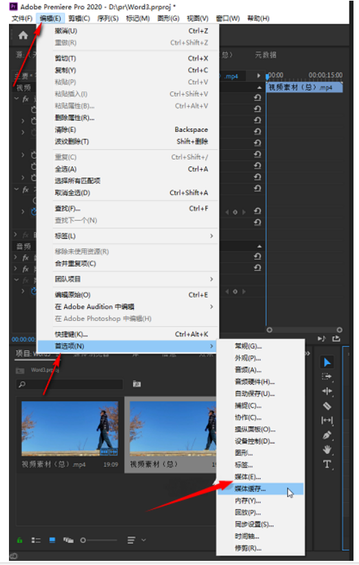 首先打开Premiere Pro,点击上方菜单栏的“编辑”,然后选择“首选项”,点击“媒体”。