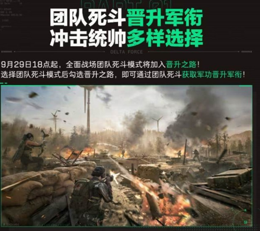 全面战场团队死斗模式将加入晋升之路,玩家可以通过团队死斗获取军功晋升军衔。选择团队死斗模式后勾选晋升之路,即可通过团队死斗获得军功晋升军衔。
