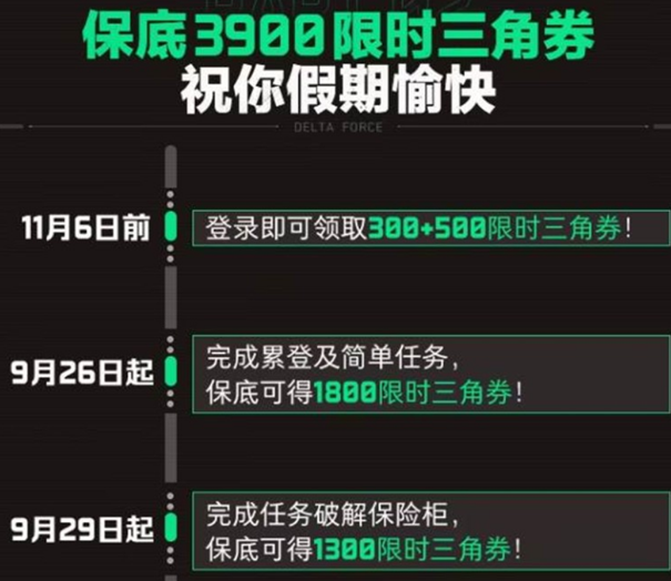 9月26日起:完成累登及简单任务,保底可得1800限时三角券。