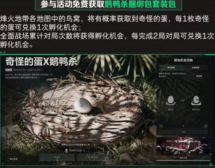 参与活动免费获取鹅鸭杀捆绑包套装包,烽火地带各地图中的鸟窝,将有概率获取到奇怪的蛋,每1枚奇怪的蛋可兑换1次孵化机会;全面战场累计对局次数将获得孵化机会,每完成2局对局可兑换1次孵化机会。