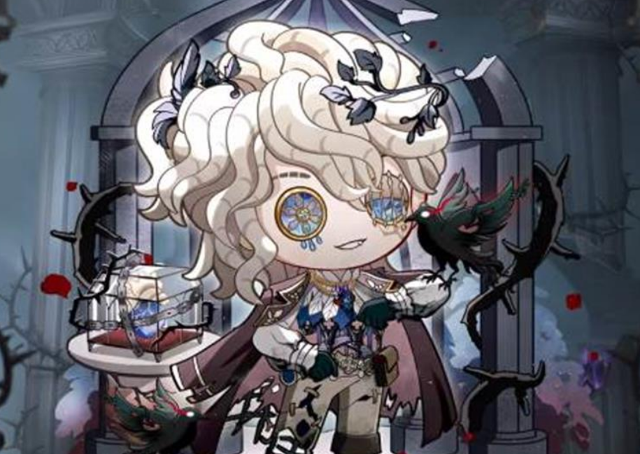 细节上,黑马甲保留基础款,胸前设镂空支架;白衬衣为宽松袖型,配精致衣领;戴恐怖感乌鸦元素项链;长裤小腿及鞋部带碎玻璃质感;面部有破损墙皮纹理;部分头发换为藤蔓并延伸至马尾,马尾饰低调黑羽毛;手持缠锁链玻璃盒,内装非写实发光金属心脏。
