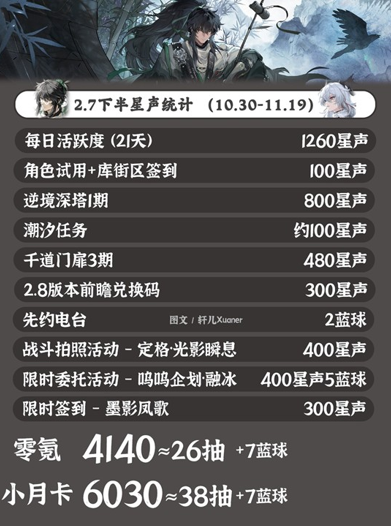 逆境深塔1期与千道门扉3期作为周常挑战玩法,每期共可获取1280星声,建议每周按时完成以积累养成资源。活动方面,10月30日至11月19日开启战斗拍照活动定格·光影瞬息,参与即可获得限定奖励;同期进行的还有限时签到活动墨影凤歌,连续登录即可领取素材与星声。11月6日至19日开放限时委托呜呜企划·融冰,完成指定任务可获得纪念道具与养成材料。此外,11月12日至19日期间,声骸材料掉落双倍,是提升角色声骸系统效率的最佳时机。