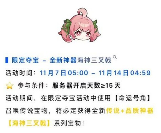 在活动期间,勇者们可以通过使用【命运号角】召唤传说宝物,必定获得全新传说+品质神器【海神三叉戟】系列宝物之一。此外,每50次夺宝必得【海神三叉戟】系列宝物之一!