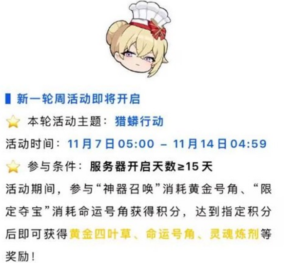 活动期间,参与“神器召唤”消耗黄金号角、“限定夺宝”消耗命运号角获得积分,达到指定积分后即可获得黄金四叶草、命运号角、灵魂炼剂等奖励!