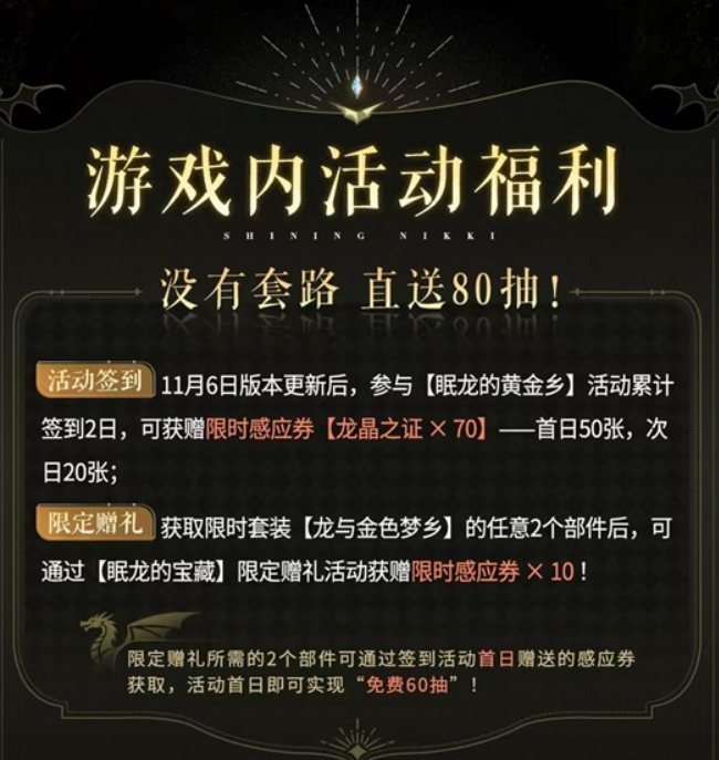 1.获得闪·熠套装【龙与金色梦乡】任意2个部件后,可解锁全新赠礼【眠龙的宝藏】,额外领取「龙晶之证」×10——