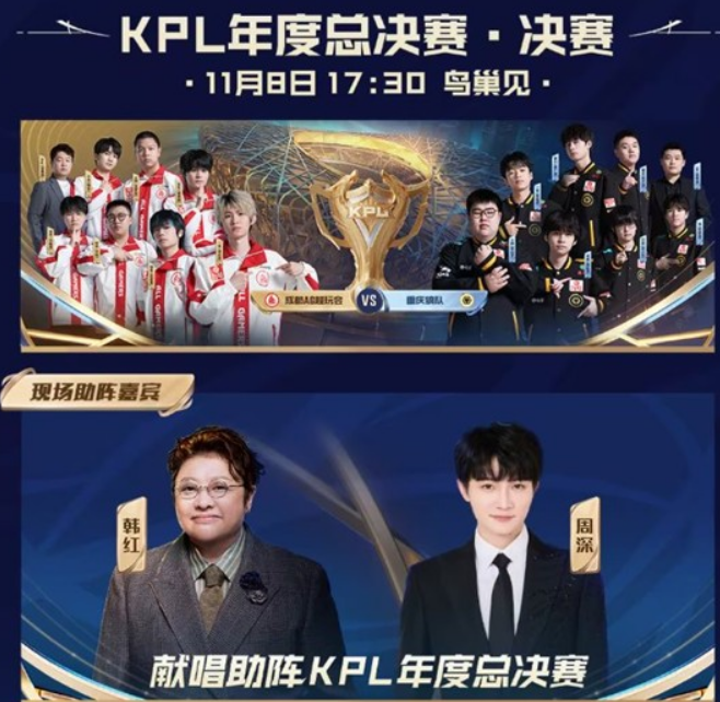本次决赛对阵双方为成都AG超玩会与重庆狼队,两支传奇战队将在鸟巢展开终极较量。官方特邀韩红、周深等顶级嘉宾现场助阵,用音乐燃动决战之夜。无论亲临现场还是线上观赛,都将享受史无前例的豪华礼遇!