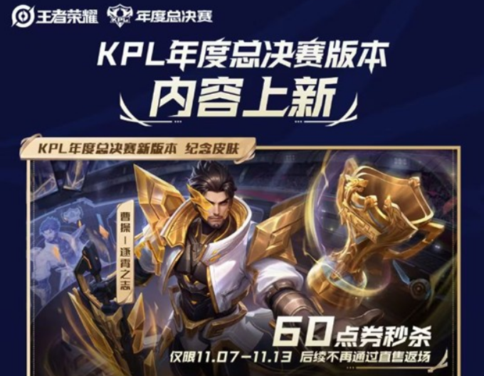 为纪念这一电竞盛事,KPL年度总决赛限定皮肤——曹操「一霄之志」将于今日(11月7日)正式开售!