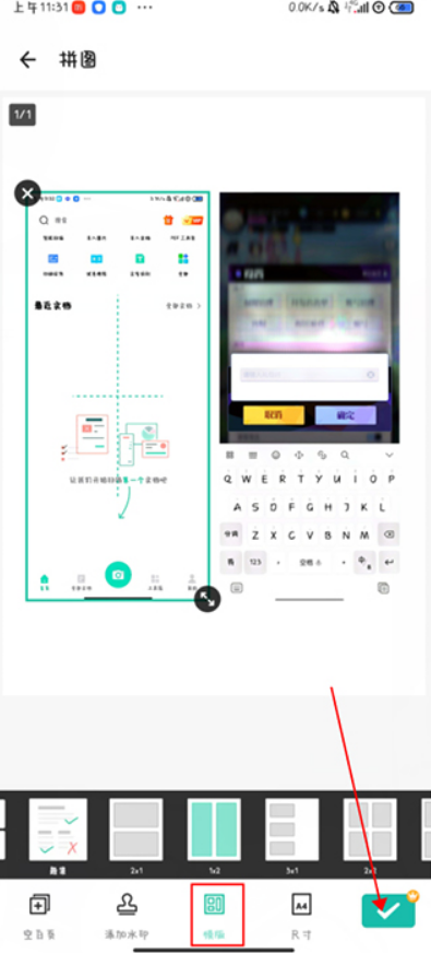 来到拼图页面,选择好合并图片模板之后点击右下角的“勾号”按钮即可。