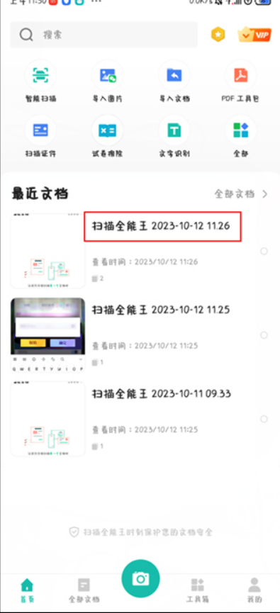 打开扫描全能王app,进入app首页,在最近文档列表下选择一个需要合并多张图片的文档并点击进入;