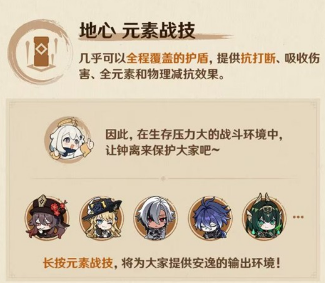 钟离是一位拥有地心元素战技的强大角色,他的技能几乎可以全程覆盖护盾,提供抗打断和吸收伤害的能力。他不仅能够抵消伤害、减抗,还具有抗打断的效果,是队伍中坚实的后盾。钟离的加入,无疑将大大增强玩家的队伍防御能力。