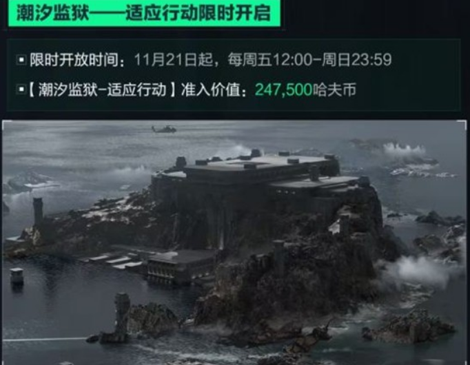 从11月21日起,每周五12:00至周日23:59,潮汐监狱——适应行动将限时开启。玩家需要支付247,500哈夫币才能进入,这将是一次考验团队协作和个人技巧的挑战。