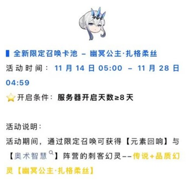 幽冥公主·扎格柔丝是一位传说+品质的刺客,擅长元素回响和奥术智慧阵营。她将在11月14日05:00至11月28日04:59期间,通过全新限定召唤卡池登场。玩家可以通过限定召唤获得这位强大的刺客幻灵,提升自己的战斗实力。
