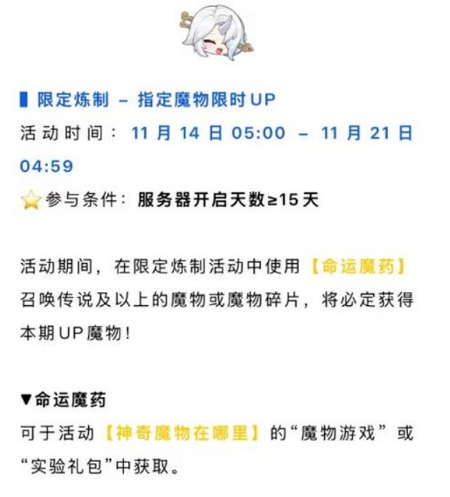 活动期间,在限定炼制活动中使用【命运魔药】召唤传说及以上的魔物或魔物碎片,将必定获得本期UP魔物!