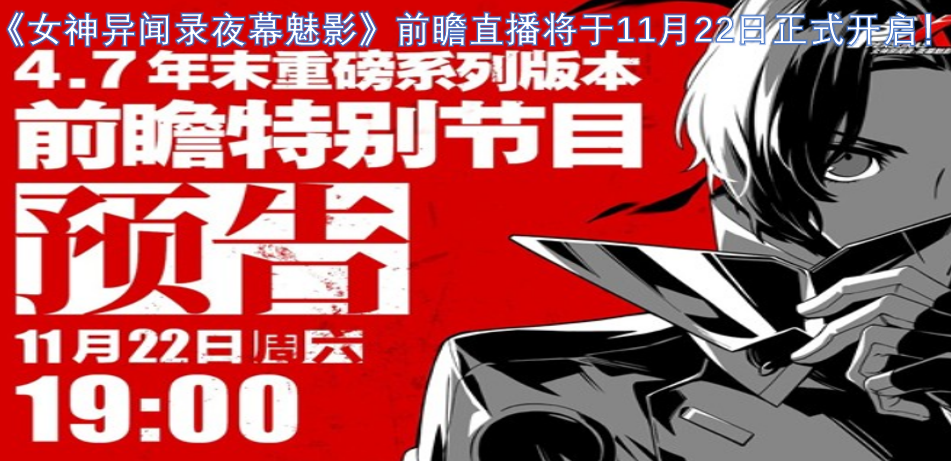 《女神异闻录:夜幕魅影》4.7年末重磅系列版本前瞻特别节目预告正式发布!该节目将于11月22日周六19:00在全平台同步放送,为玩家们带来年末的压轴重磅更新内容。以下是小编为大家准备的详细资讯,有兴趣的玩家们可以前来一起看看!