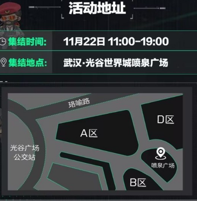 活动将在武汉光谷世界城喷泉广场举行,集结时间为11月22日11:00-19:00。现场将分为A区和B区,观众可以根据指引前往相应区域。