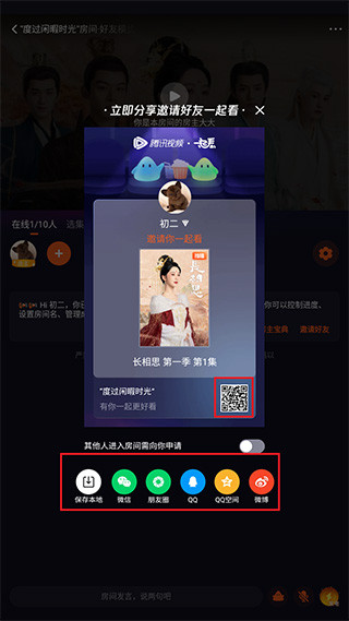 生成的二维码让你的好朋友扫描一下或者发送连接点击就可以实现多人一起看电影啦