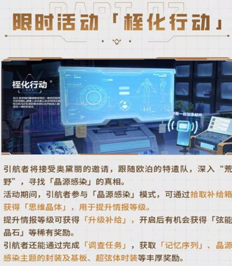 在晶源感染版本中,限时活动桎化行动也将同步开启。引航者将接受奥黛丽的邀请,跟随欧泊的特遣队,深入荒野,寻找晶源感染的真相。活动期间,引航者参与晶源感染模式,可通过拾取补给箱获得思维晶体,用于提升情报等级。提升情报等级可获得升级补给,开启后有机会获得弦能晶石等稀有奖励。引航者还能通过完成调查任务,获取记忆序列、晶源感染主题的封装及基板、超弦体时装等丰厚奖励。