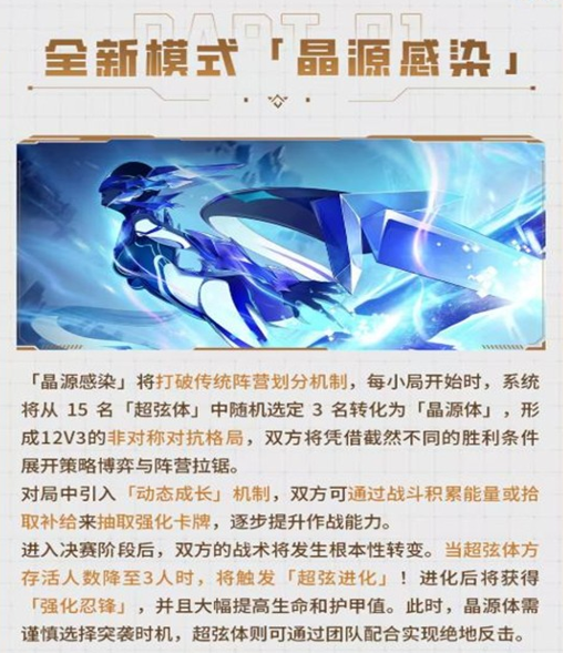 晶源感染模式将打破传统阵营划分机制,每小局开始时,系统将从15名超弦体中随机选定3名转化为晶源体,形成12V3的非对称对抗格局。双方将凭借截然不同的胜利条件展开策略博弈与阵营拉锯。对局中引入动态成长机制,双方可通过战斗积累能量或拾取补给来抽取强化卡牌,逐步提升作战能力。进入决赛阶段后,双方的战术将发生根本性转变。当超弦体方存活人数降至3人时,将触发超弦进化,进化后将获得强化忍锋,并且大幅提高生命和护甲值。此时,晶源体需谨慎选择突袭时机,超弦体则可通过团队配合实现绝地反击。