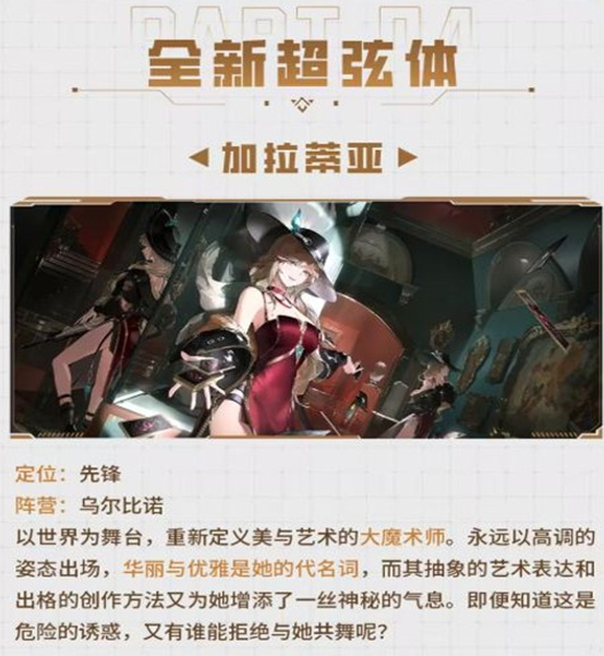 全新超弦体加拉蒂亚即将加入游戏,定位为先锋,阵营为乌尔比诺。以世界为舞台,重新定义美与艺术的大魔术师。永远以高调的姿态出场,华丽与优雅是她的代名词,而其抽象的艺术表达和出格的创作方法又为她增添了一丝神秘的气息。即便知道这是危险的诱惑,又有谁能拒绝与她共舞呢?