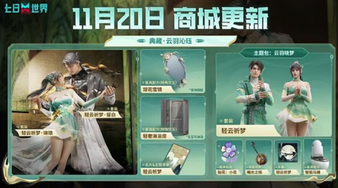 《七日世界》宣布全新典藏主题包云羽沁珏将于11月20日正式上架商城,让玩家们领略千年美学精华,感受如水墨画卷般的浪漫与优雅!以下是小编为玩家们准备的详细活动资讯内容,有兴趣的玩家们快来一起看看吧!