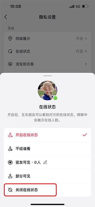 最后在弹出的页面当中选择【关闭在线状态】选项即可完成。