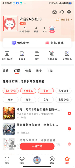 打开喜马拉雅app,进入到我的界面,点击页面上方的“头像”图标按钮;