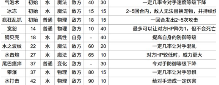 在技能选择方面,洛克王国世界章鱼小丸子可学习气泡术、冰冻、宽恕、钢贝壳、水之波纹、水击炮、尾巴瘙痒、攀瀑、水打击等多个技能。其中宽恕是一项特殊物理技能,能够将对手生命值强制降至1点,配合后续高伤技能可实现精准收割。尾巴瘙痒能降低敌方防御等级,为后续输出创造有利条件。攀瀑除了造成伤害外,还有概率使对手陷入恐惧状态,打乱对方出招节奏。水打击则提供稳定的90点物理伤害,是主力输出手段之一。