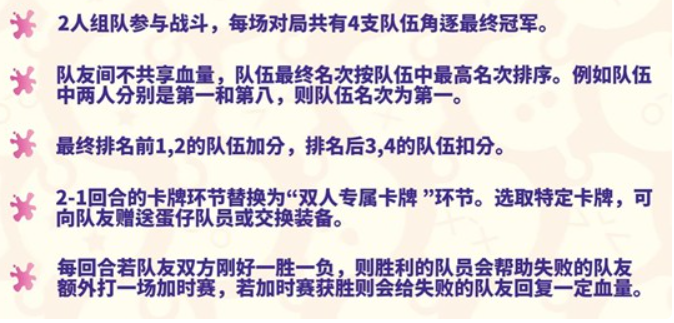 此外,2-1回合将引入“双人专属卡牌”环节,玩家可以向队友赠送蛋仔队员或交换装备,增强团队合作。如果每回合双方一胜一负,胜利的队员还会帮助失败的队友进行加时赛,获胜则可回复血量。