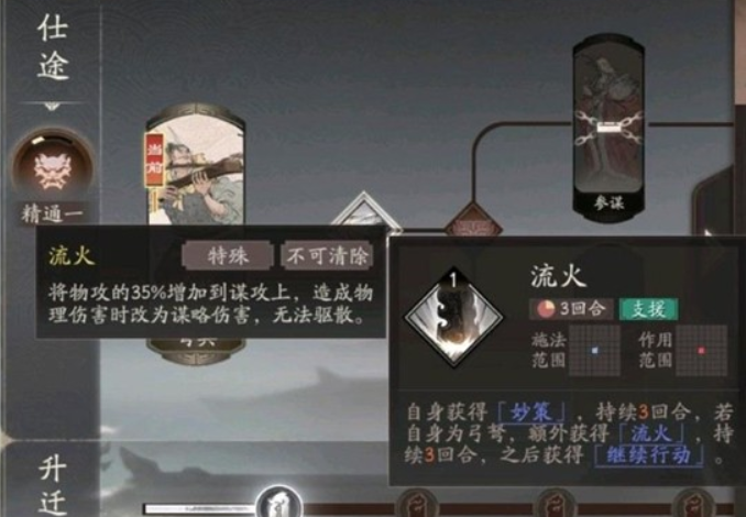 刘晔的流火效果可持续3回合生效,这是他的核心增益状态。在培养路线上,建议通过兵营系统转为弓兵职业,这与他的基础属性更为契合。弓兵的射程优势配合刘晔的高移速效果,能让他在战场上保持更好的机动性,同时天赋技能还能进一步提升移动速度。