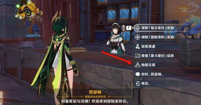 情报交易是原神中专属于秘闻馆势力角色的特殊交互玩法,目前该势力中仅有奈芙尔这一位角色。当玩家将奈芙尔编入队伍后,前往挪德卡莱地区找到凯瑟琳对话,就能看到情报交易的选项。如果队伍中没有奈芙尔,选择该选项时会提示需要秘闻馆角色才能开启此功能。