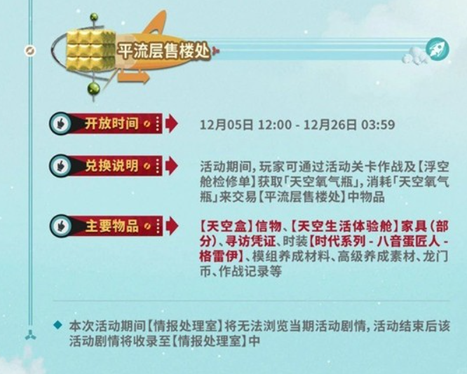 兑换说明:活动期间,玩家可通过活动关卡作战及【浮空舱检修单】获取「天空氧气瓶」,消耗「天空氧气瓶」来交易【平流层售楼处】中物品