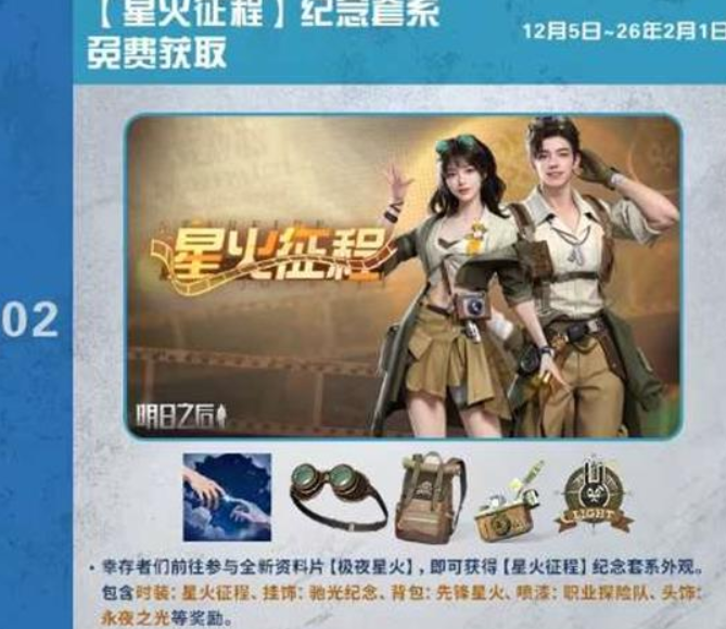 【星火征程】纪念套系外观免费获取,包括时装、挂饰、背包、喷涂、职业探险队、头饰、永夜之光等奖励。