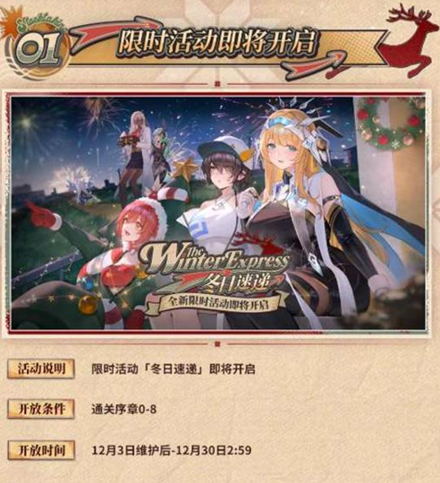 《交错战线》冬日速递版本将于12月3日正式上线,玩家们可以期待在这个冬日里,与游戏中的角色们一起度过一个充满欢乐和惊喜的季节。别忘了参与各项活动,赢取丰厚的奖励哦!