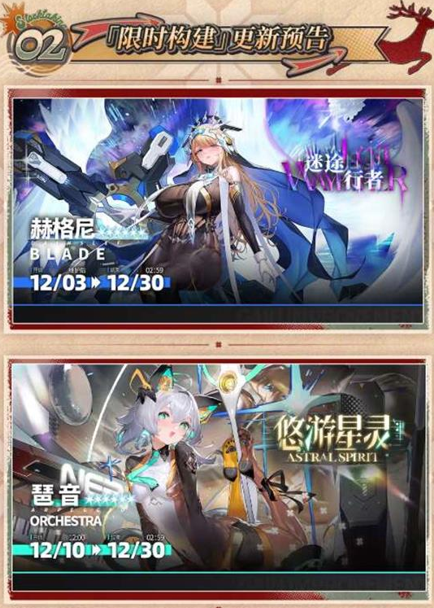 限时构建「迷途行者」和「悠游星灵」即将开启,灭刃六星队员“赫格尼”、乐团六星队员“琶音”登场,且构建获得该队员概率提升!