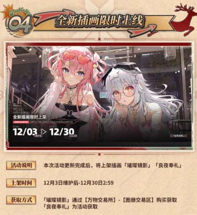 「赤诚之礼-赫格尼」、「圣夜情缠-鸣刃」、「圣诞嬉闹-熔铄」、「圣诞恋曲-琶音」、「专属礼物-坍陨」、「禁忌游戏-哈迪斯」等全新插画将在活动期间上架。