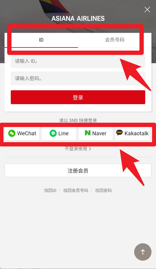 1、在登录页面可输入ID和密码完成登录,也可通过会员号码、微信、Line等快速登录。