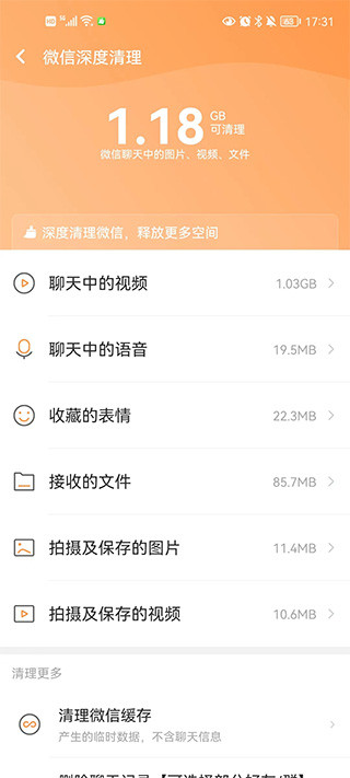 独有的微信专项清理功能,可清除聊天缓存、语音文件、视频与图片残留,优化占用空间,提升运行速度。