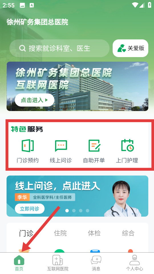 3、APP首页设有搜索就诊科室医生栏与关爱版入口,中间有徐州矿务集团总医院互联网医院入口及特色服务、线上问诊医生推荐。