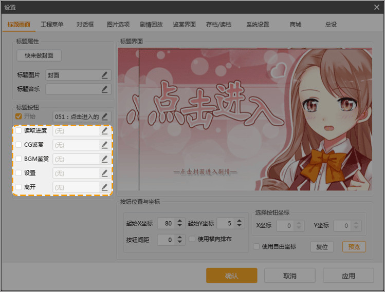 3、取消“读取进度”、“CG鉴赏”、“BGM鉴赏”、“设置”、“离开”按钮。
