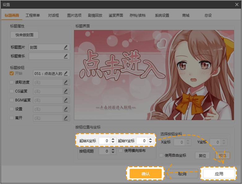 4、调整开始按钮坐标为“X:0,Y:0”,点击“应用”,点击“确定”。这里我们需要注意的是,开始按钮坐标位置必须为“X:0,Y:0”,否者封面按钮无法铺满画面。