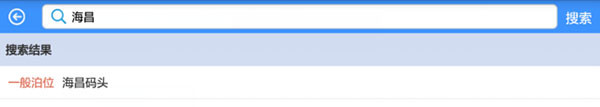 1、只要点击右上角的放大镜按钮,进入搜索栏,直接输入目的地的关键字中文、拼音,或者目标船舶的MMSI码、船名中文、拼音都可以,点击搜索。例如:江都港海昌码头,只需要输入“海昌”两个关键字,点击搜索即可找到。