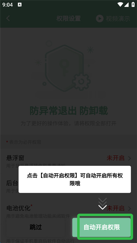 7、然后点击【自动开启权限】,即可开启所有权限。
