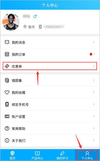 1、打开易学仕在线app,进入“个人中心”,点击“优惠券”。