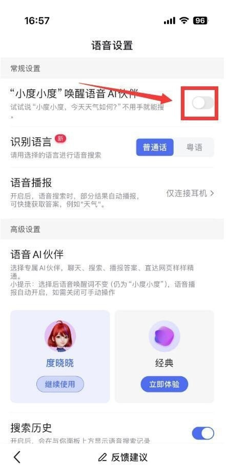 5、进入语音设置,点击“小度小度唤醒语音ai伙伴”右侧按钮开启。