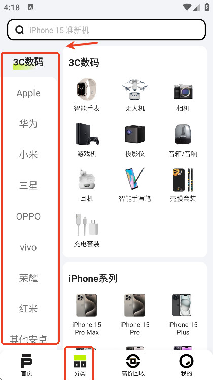 2、登录后,用户们可以在分类页面挑选自己喜欢的二手手机和3C数码产品