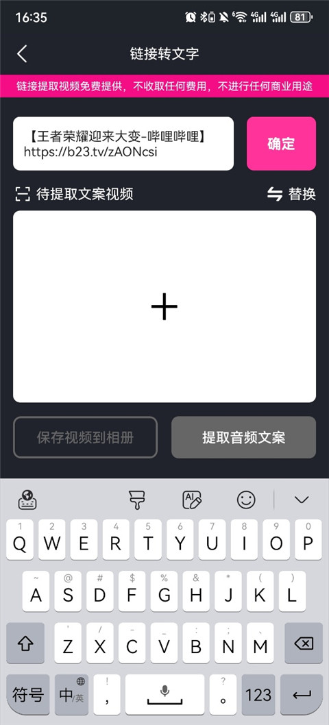 2、用户需要复制你需要获取文字视频链接,并点击确认;