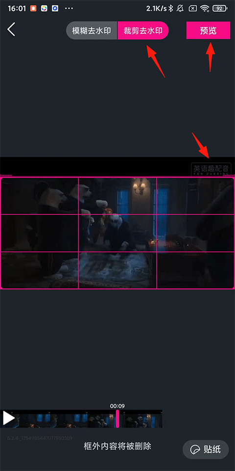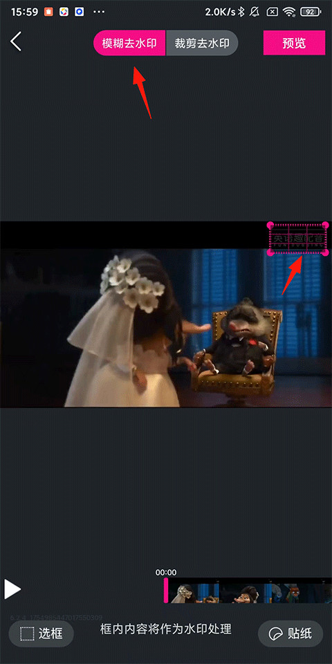 5、【裁剪去水印】框选无水印位置,框外内容将被删除,最后点击【预览】并进行导出。(注:此功能需要开通会员)